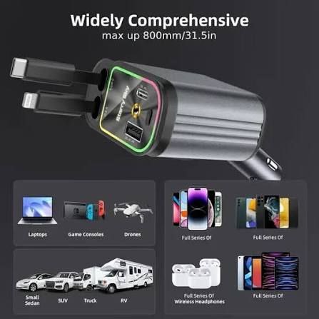 Avec ses ports USB et USB-C, ce chargeur est universellement compatible et s'adapte à tous vos besoins, que vous voyagiez en voiture de tourisme, en SUV, en camion ou en camping-car. Il peut charger simultanément des ordinateurs portables, des consoles de jeu, des drones, et l'ensemble des gammes de smartphones et de casques sans fil. D'une puissance exceptionnelle, il se glisse discrètement dans votre allume-cigare tout en offrant une polyvalence inégalée. Faites de chaque trajet une expérience sans souci et restez toujours connecté