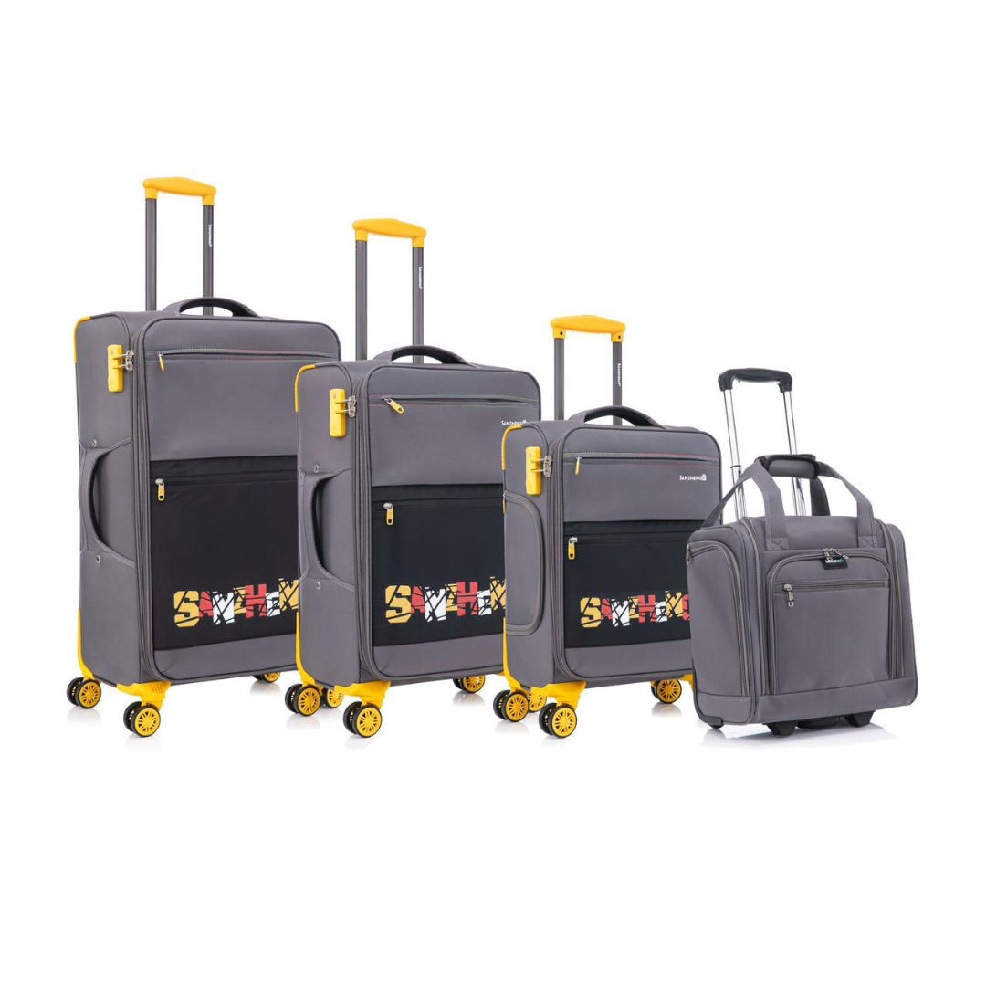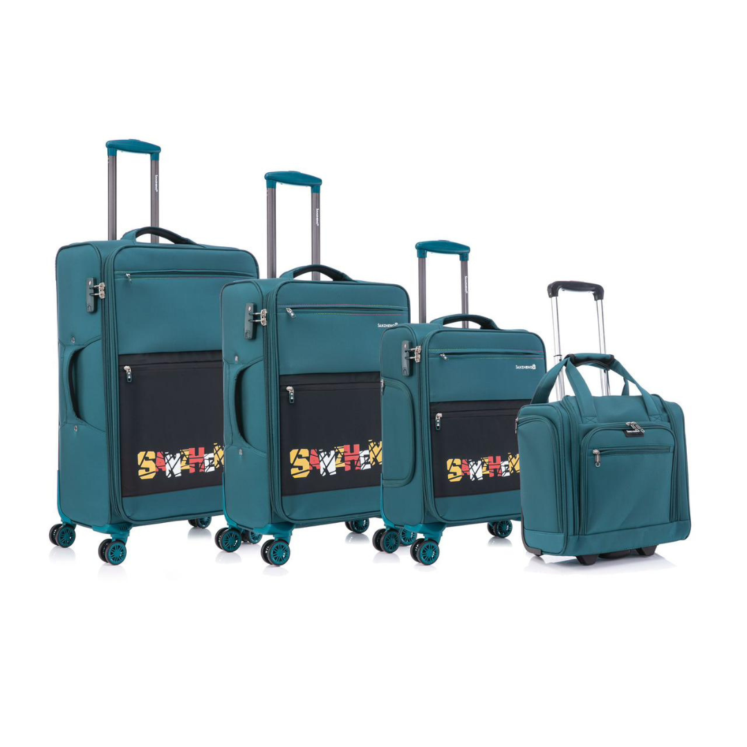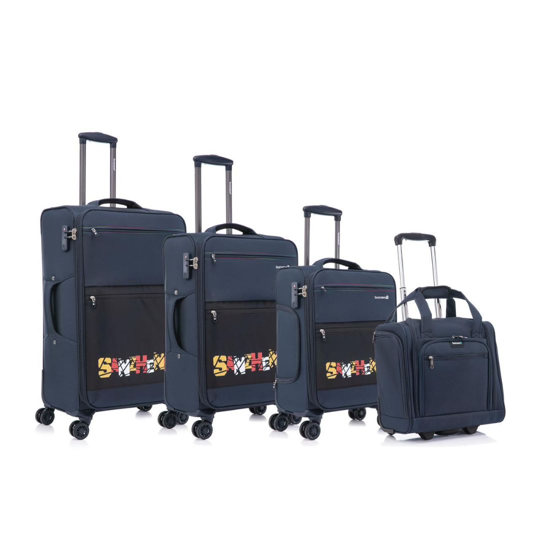 La collection se compose d'une valise cabine idéale pour les courts séjours, mesurant environ 55 cm x 35 cm x 20 cm, de deux valises intermédiaires pour des voyages prolongés, avec des dimensions d'environ 65 cm x 40 cm x 25 cm et 75 cm x 45 cm x 30 cm, complétée par un sac de voyage assorti, parfait pour les compléments de dernière minute.