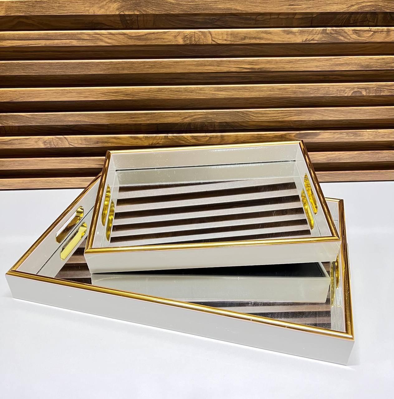 3 Ensemble de plateaux décoratifs en métal doré avec fond miroir et bordure ajourée