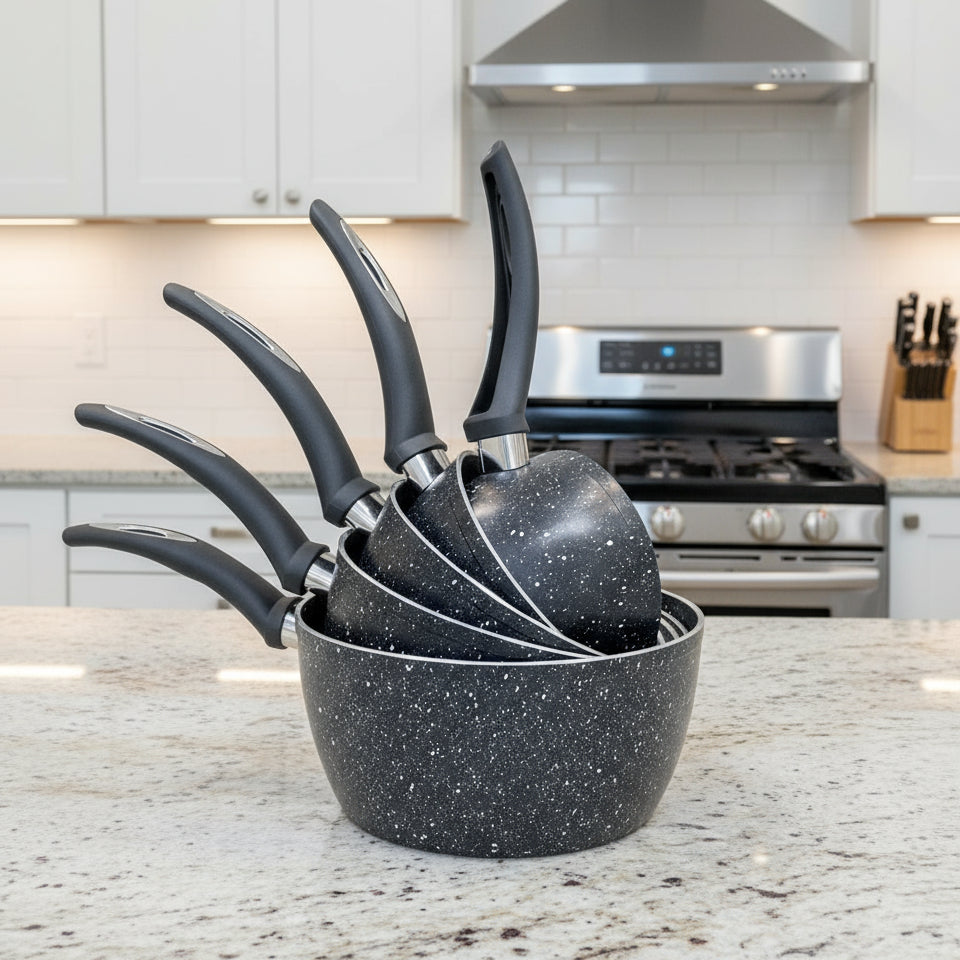 Découvrez cet ensemble de 5 casseroles au design effet pierre, alliant durabilité, confort d’utilisation et modernité.
