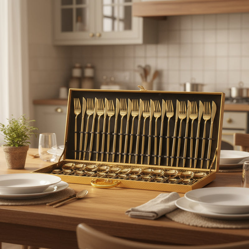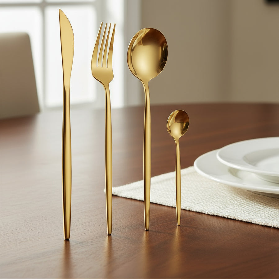 Conçue en acier inoxydable de haute qualité , cette vaisselle dorée allie raffinement, durabilité et respect de l’environnement .