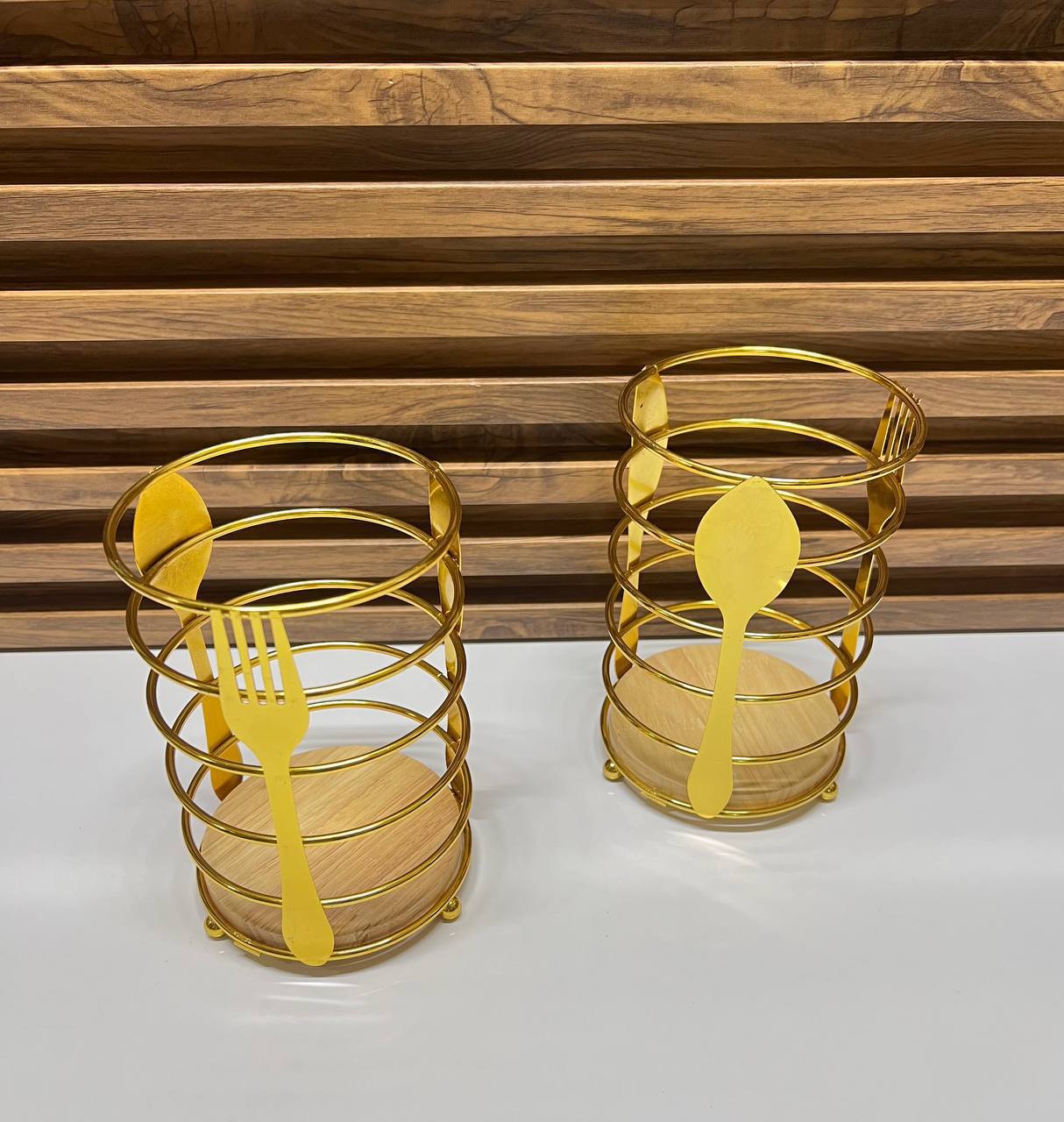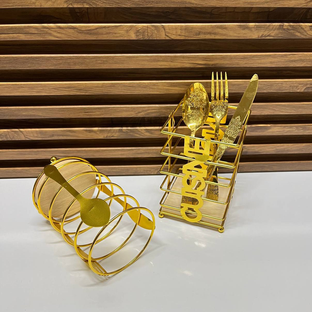 Fabriqués pour durer, ces couverts dorés résistent à l'usure et conservent leur brillance au fil du temps, garantissant une utilisation durable et élégante. L'ensemble comprend deux supports uniques. L'un est un support vertical en métal doré avec des détails calligraphiques décoratifs, parfait pour présenter élégamment les couverts à table. L'autre est un porte-serviettes ou organiseur circulaire en métal doré avec une base en bois, ajoutant une touche d'originalité et de praticité. Ces supports ne servent pas uniquement au rangement ;