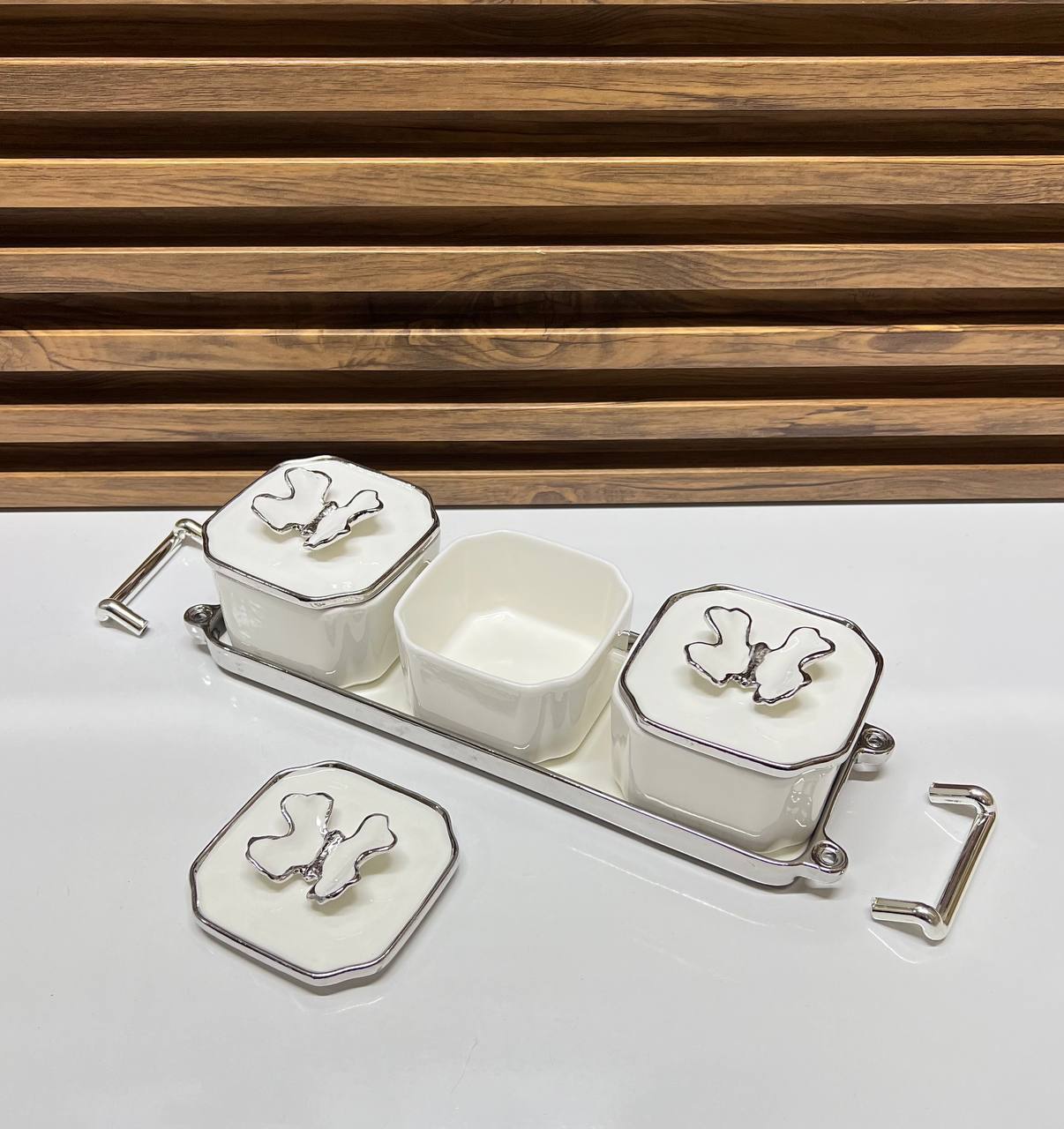 Ensemble de service triple en céramique blanche avec détails papillons argentés et plateau de service élégant