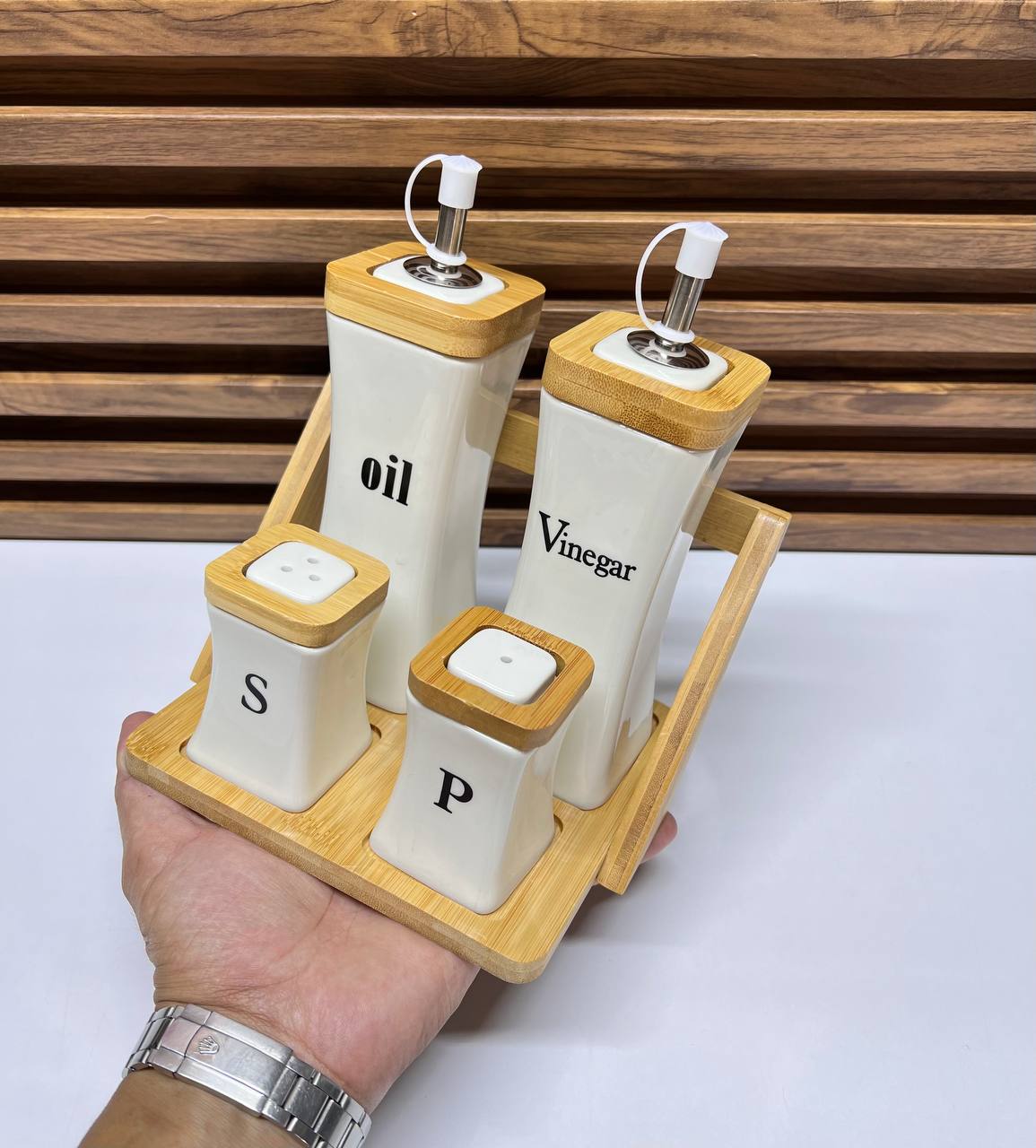 Ensemble Huile & Vinaigre en céramique avec support en bambou