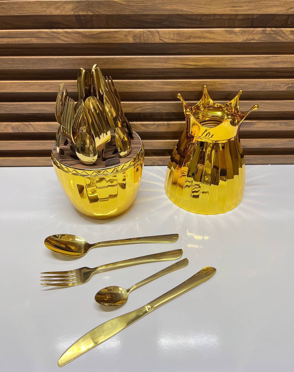 Le service complet de couverts, d'une qualité supérieure, se range élégamment dans un support au design unique et sophistiqué. Son corps à facettes, qui capte et diffuse la lumière, est surmonté d'une majestueuse couronne, transformant le rangement de vos couverts en une pièce maîtresse digne des plus grandes occasions. Disponible en finition or éclatant pour une touche de faste et en argent poli pour un raffinement intemporel,