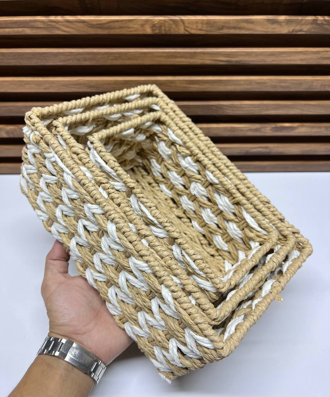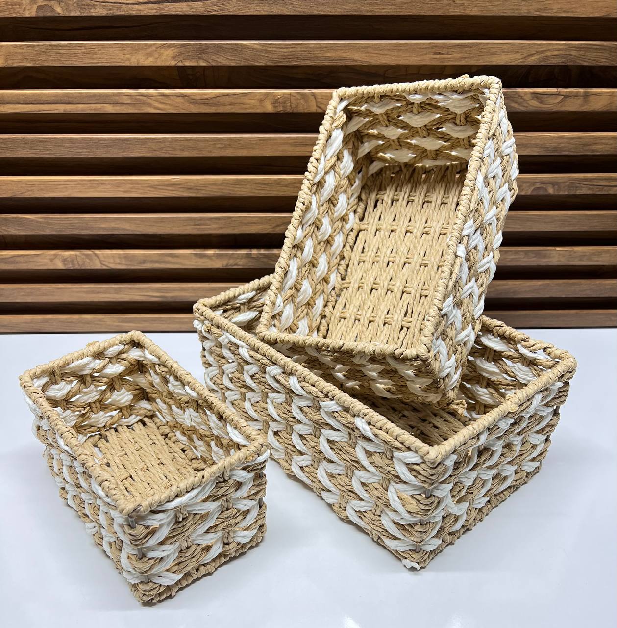 Fabriqués à la main à partir de fibres naturelles de haute qualité, ces paniers se distinguent par un motif de tressage unique et un contraste de couleurs apaisant, mêlant le beige naturel et le blanc épuré. Leur conception soignée leur confère une solidité et une durabilité à toute épreuve, tout en restant légers et faciles à manipuler.