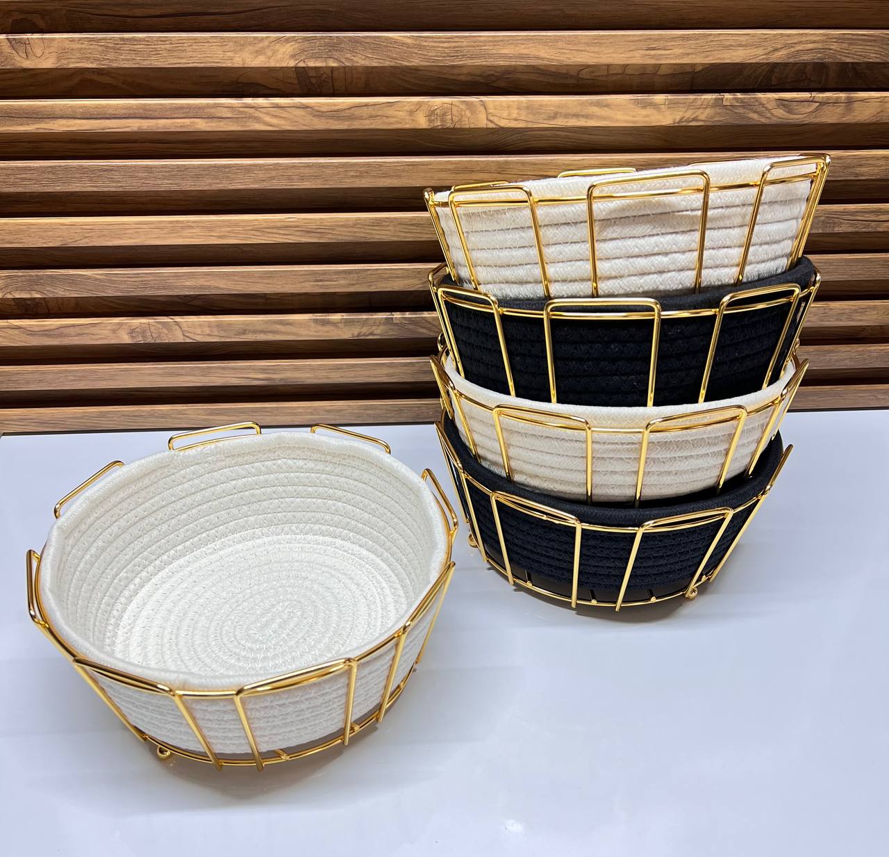 Optimisez votre espace et ajoutez une touche de raffinement à votre intérieur avec nos paniers de rangement en corde tressée et métal doré. Cet ensemble de paniers allie la douceur du coton et la robustesse du métal pour une solution de rangement à la fois pratique et esthétique.