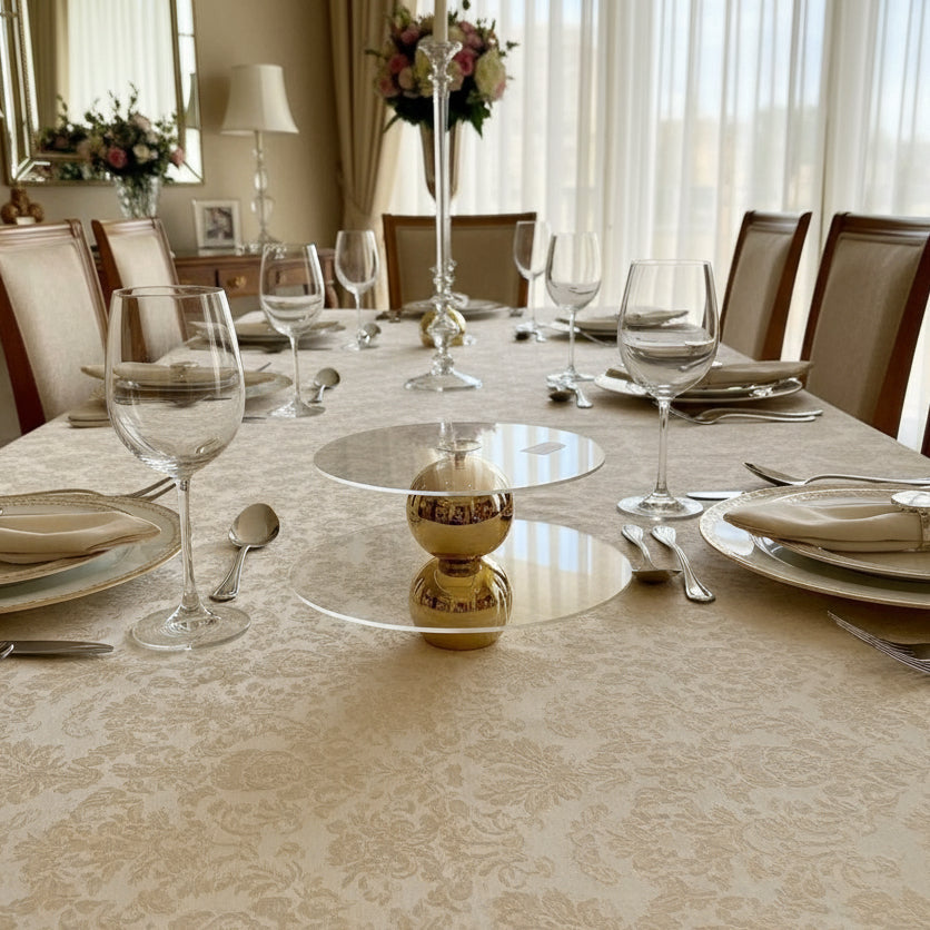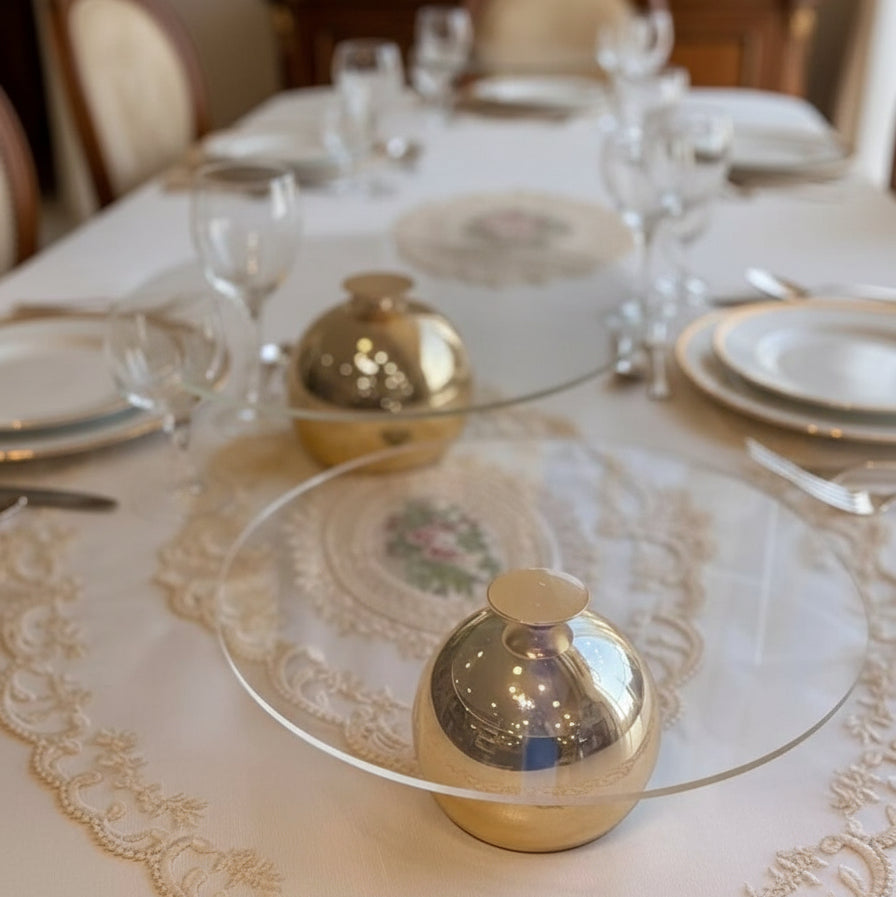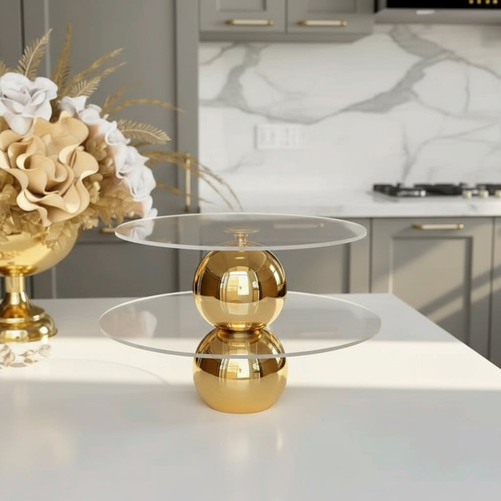 Composé d’un plateau en verre transparent posé sur une base dorée sphérique brillante 🪩, il allie élégance et minimalisme pour mettre en valeur vos gâteaux, fruits, douceurs ou décorations.
