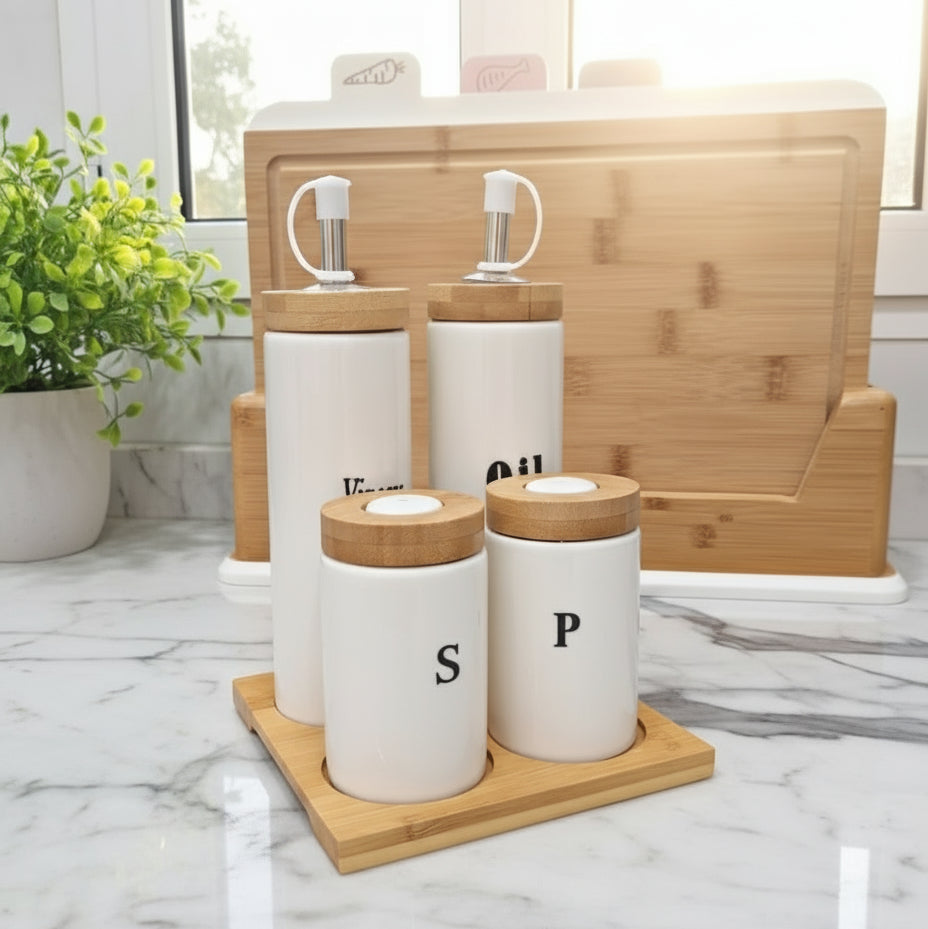 Set d’assaisonnement Huilier, Vinaigrier, Sel & Poivre avec plateau en bambou