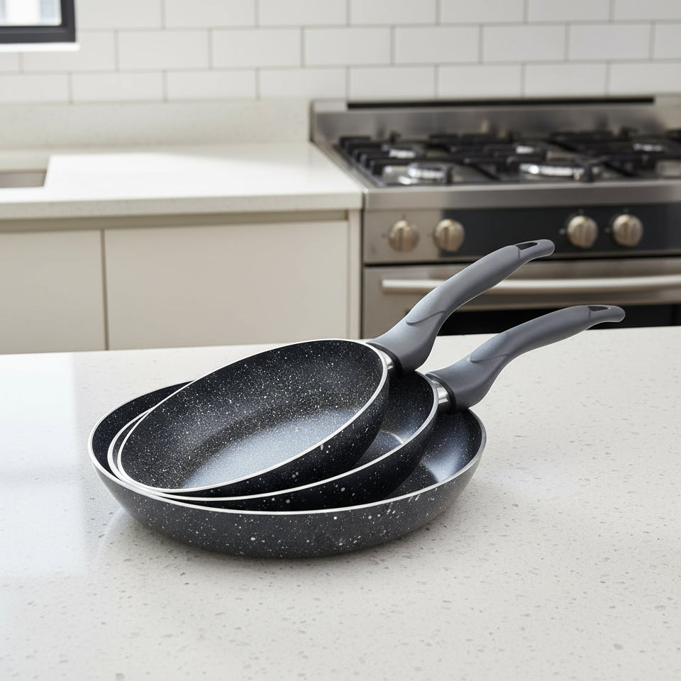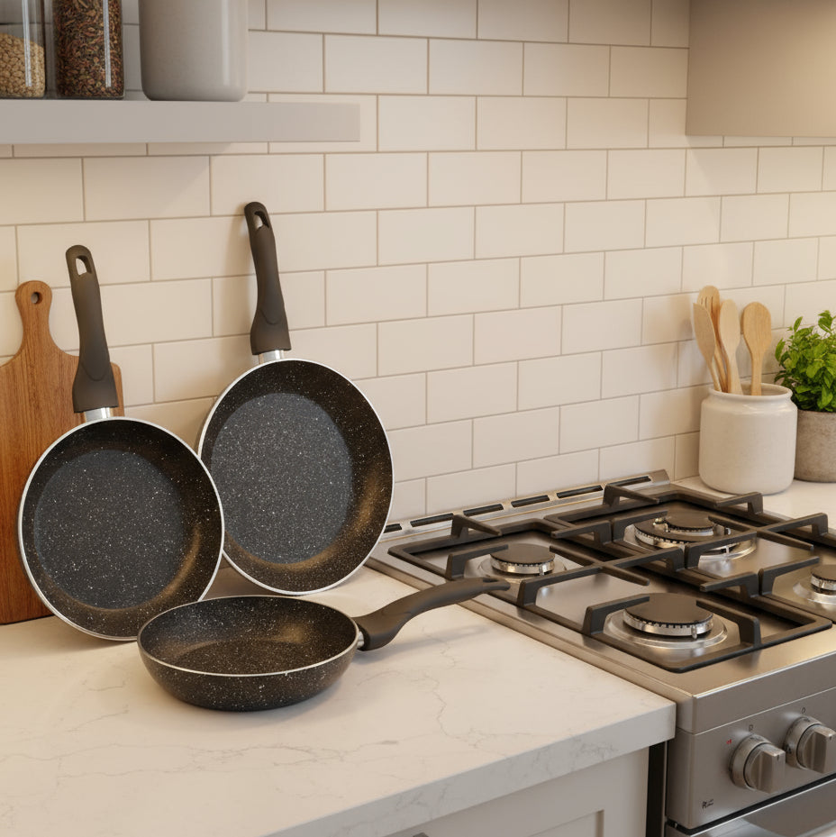 Ce set de 3 poêles effet pierre est l’indispensable de toute cuisine élégante et pratique.