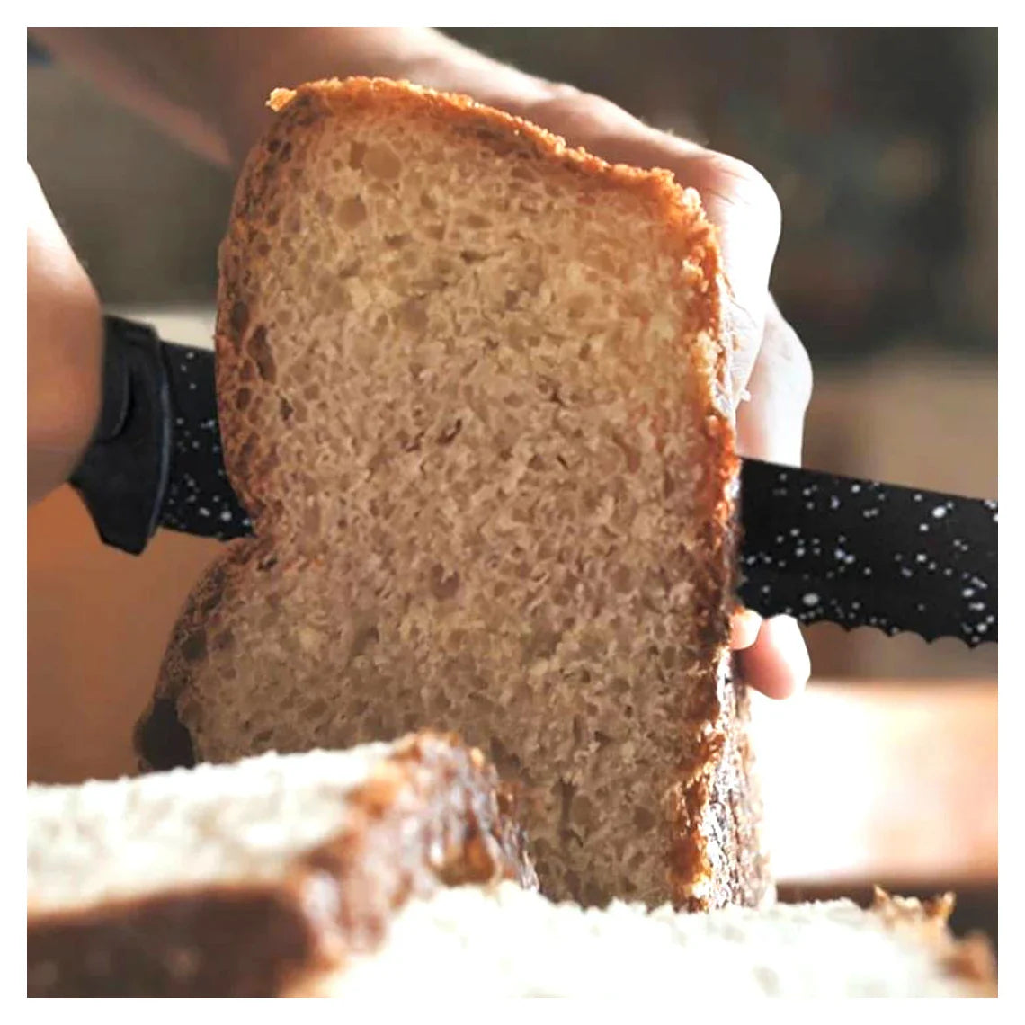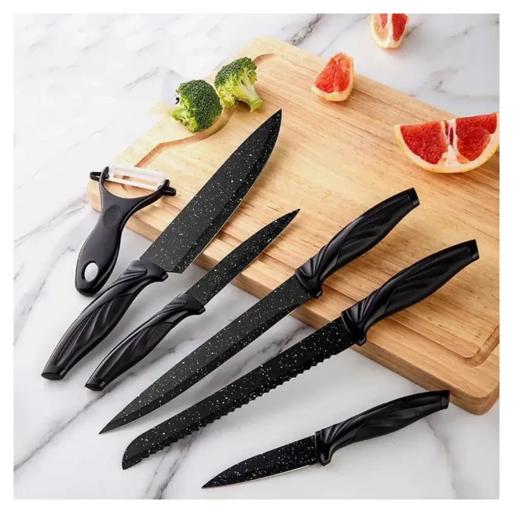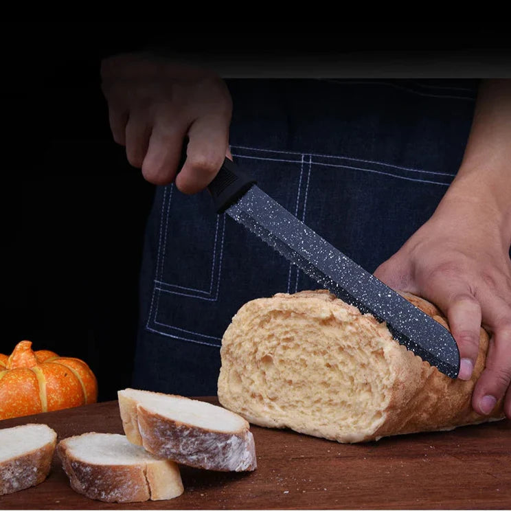 🔪 Ensemble Complet pour Toutes les Tâches : Ce kit comprend un couteau Santoku pour la découpe des légumes, un couteau à pain dentelé, un couteau à trancher, un couteau de chef idéal pour les fromages, un couteau utilitaire et un couteau d'office pour les petites découpes.