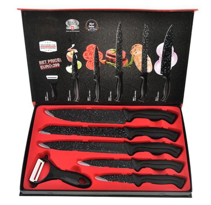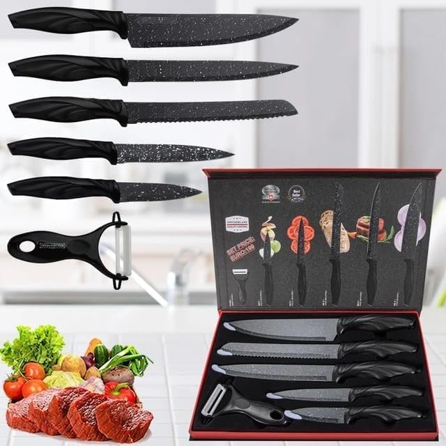🔪 Polyvalence Totale : Ce set complet comprend un couteau de chef, un couteau à trancher, un couteau à steak, un couteau à fruits, des ciseaux de cuisine, un couteau en céramique pour éplucher, ainsi qu'un coffret cadeau élégant.