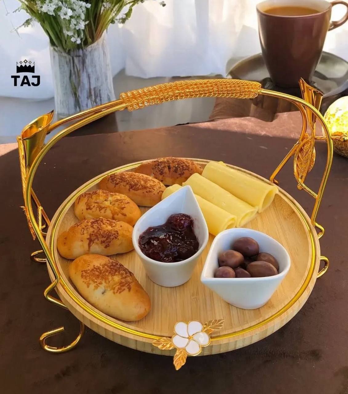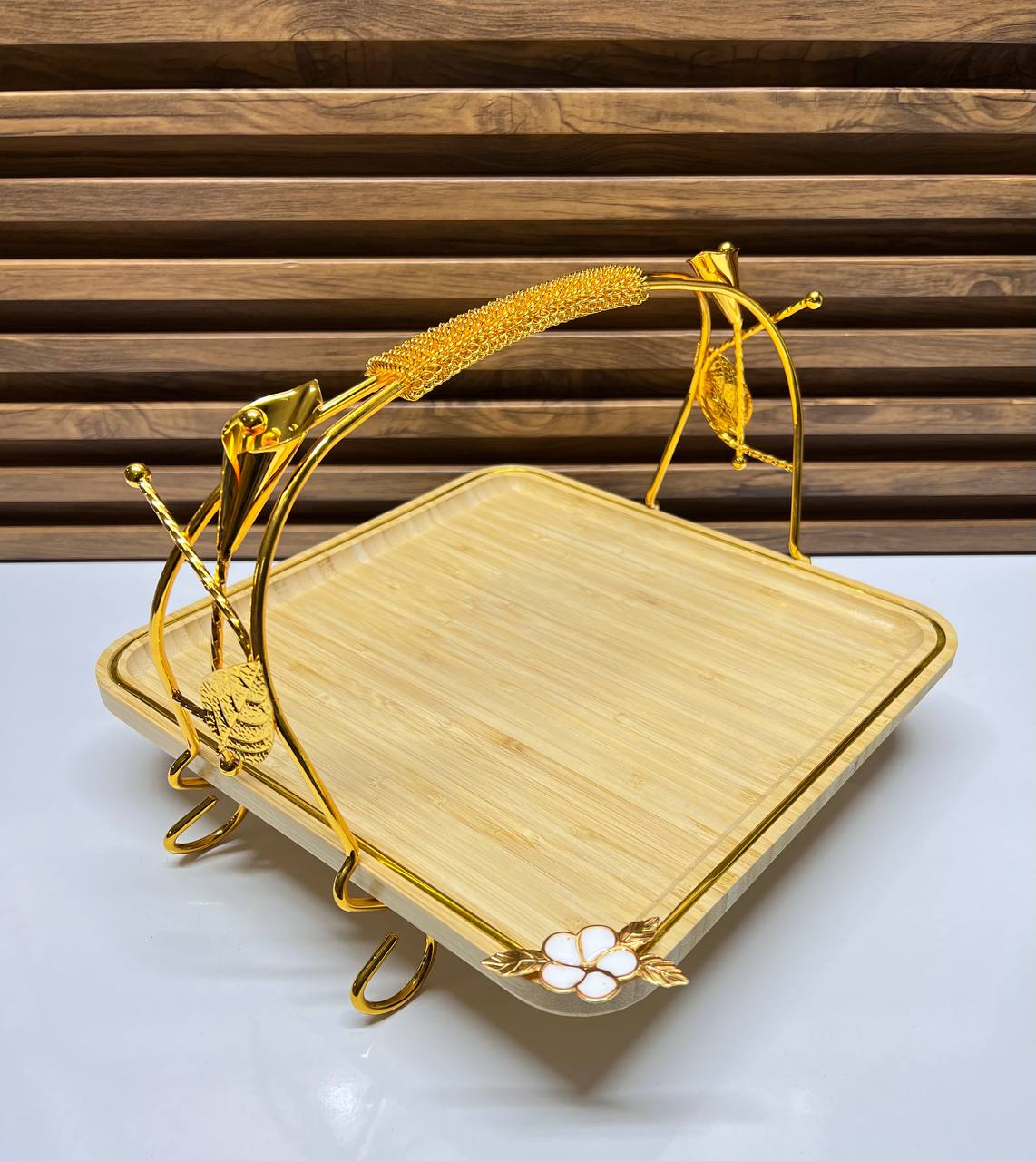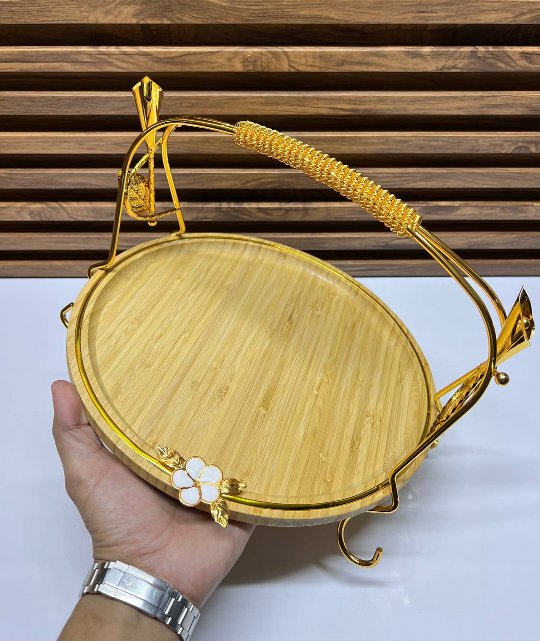 Sa structure métallique dorée, ornée de motifs délicats de feuilles et de fleurs, lui confère un design unique et luxueux, faisant de chaque présentation un spectacle pour les yeux.
